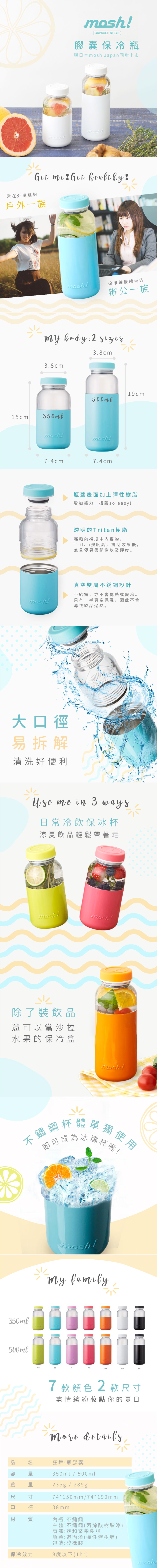 這款杯子的容量有350ml與500ml兩種,共有7種顏色。無論是正在使用「mosh!」系列其他款的人,或是正在尋找合適的杯子的人,都建議使用這款「mosh!膠囊杯」。