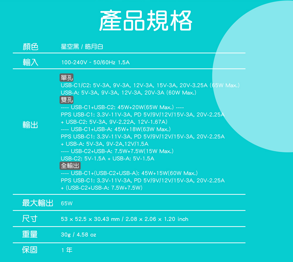 ● USB-C/PD 65W大功率