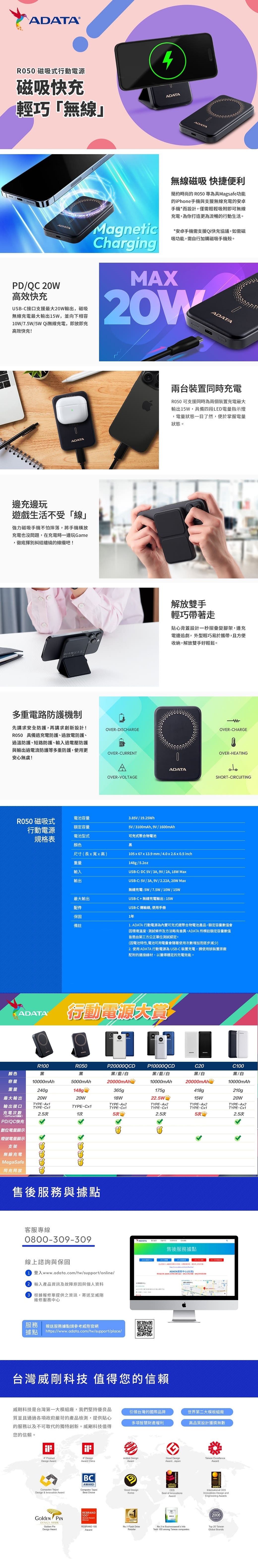 包裝內容物:R050磁吸行動電源*1、USB-C充電線*1、使用說明書*1