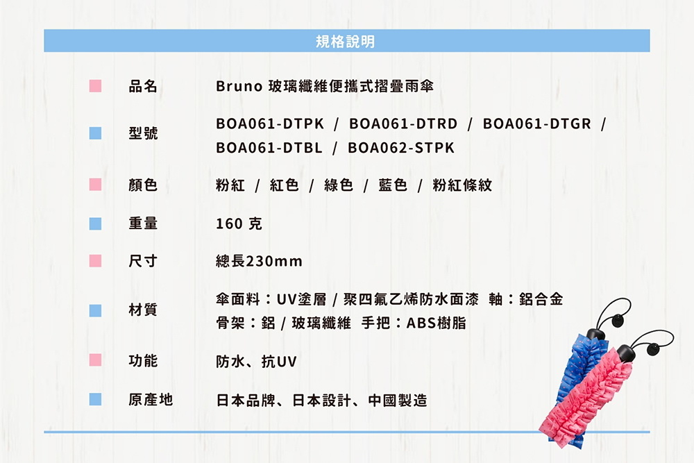 【玻璃纖維便攜式摺疊雨傘BOA061/062.商品規格】